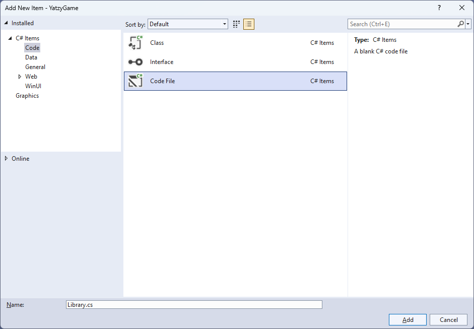 Then in Add New Item from the C# Items list, select Code and then select Code File from the list next to this, then type in the name of Library.cs and then Click on Add.